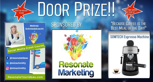 We have a NEW SPONSOR for next week's networking meeting. When you get a chance, thank our own Melinda Schmiedeknecht of Resonate Your Ideas for coming up to the plate and sponsoring an Espresso Machine as the grand door prize!!