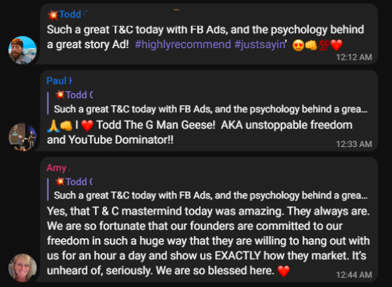 "We are so fortunate that our founders are committed to our freedom in such a huge way that they are willing to hang out with us for an hour a day and show us EXACTLY how they market. It’s unheard of, seriously. We are so blessed here."