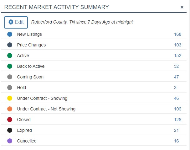 Overall, the Rutherford County real estate market has been active with a mix of new listings, sales, and changes in status.