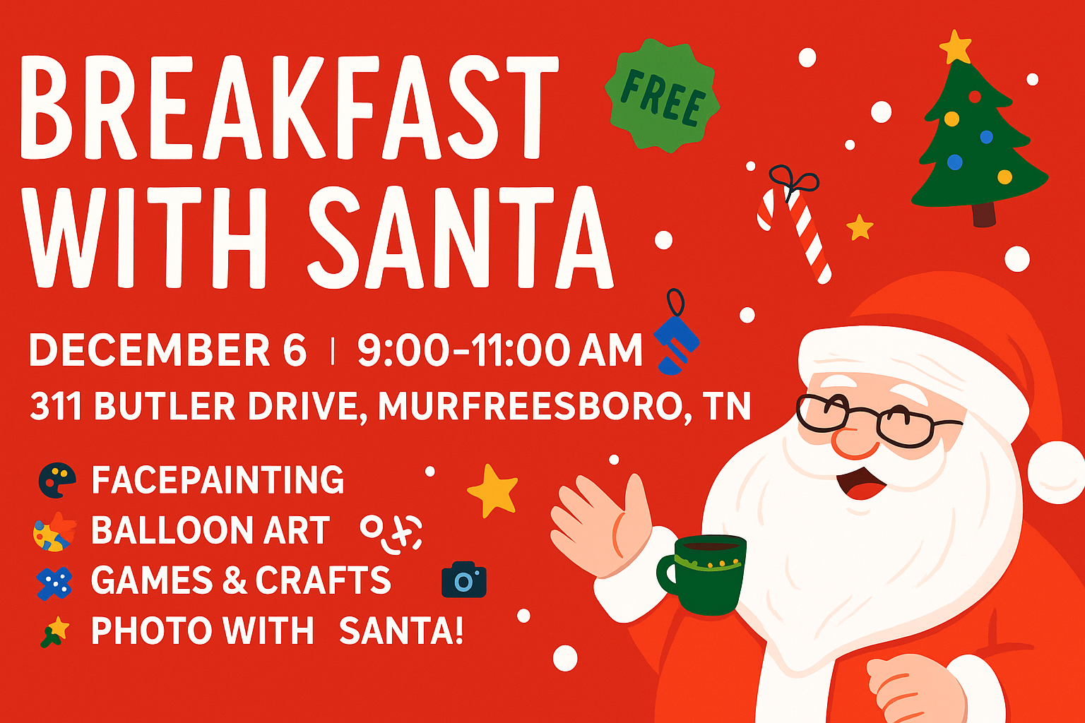 Bring the kids to enjoy: 🎄 A FREE family breakfast 📸 Photos with Santa 🎨 Face painting & balloon art 🎲 Games, crafts, and holiday fun with Santa’s helpers!