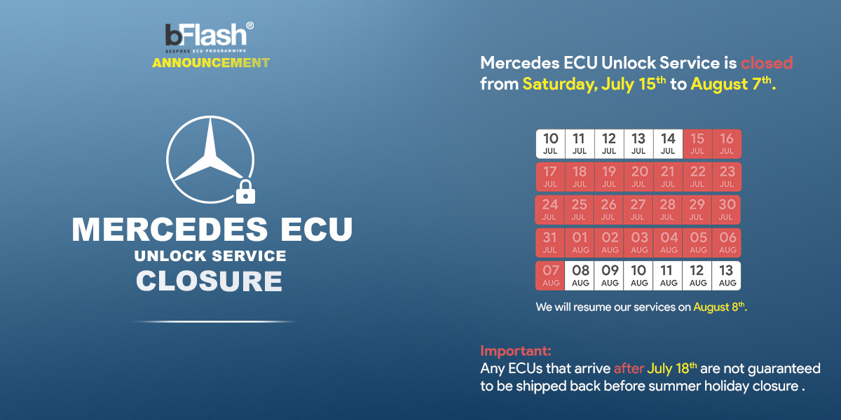 | Mercedes ECU Unlock Service will be on | | As we are gearing up for the Summer Holidays break, we would like to inform you about the temporary closure of Mercedes ECU Unlock Services from July 15th to August 7th. Any ECUs received after July 18th are not guaranteed to be shipped back before the summer holiday closure. We will be back on Tuesday, August 8th as usual. Dimitri and the team at bFlash. | |