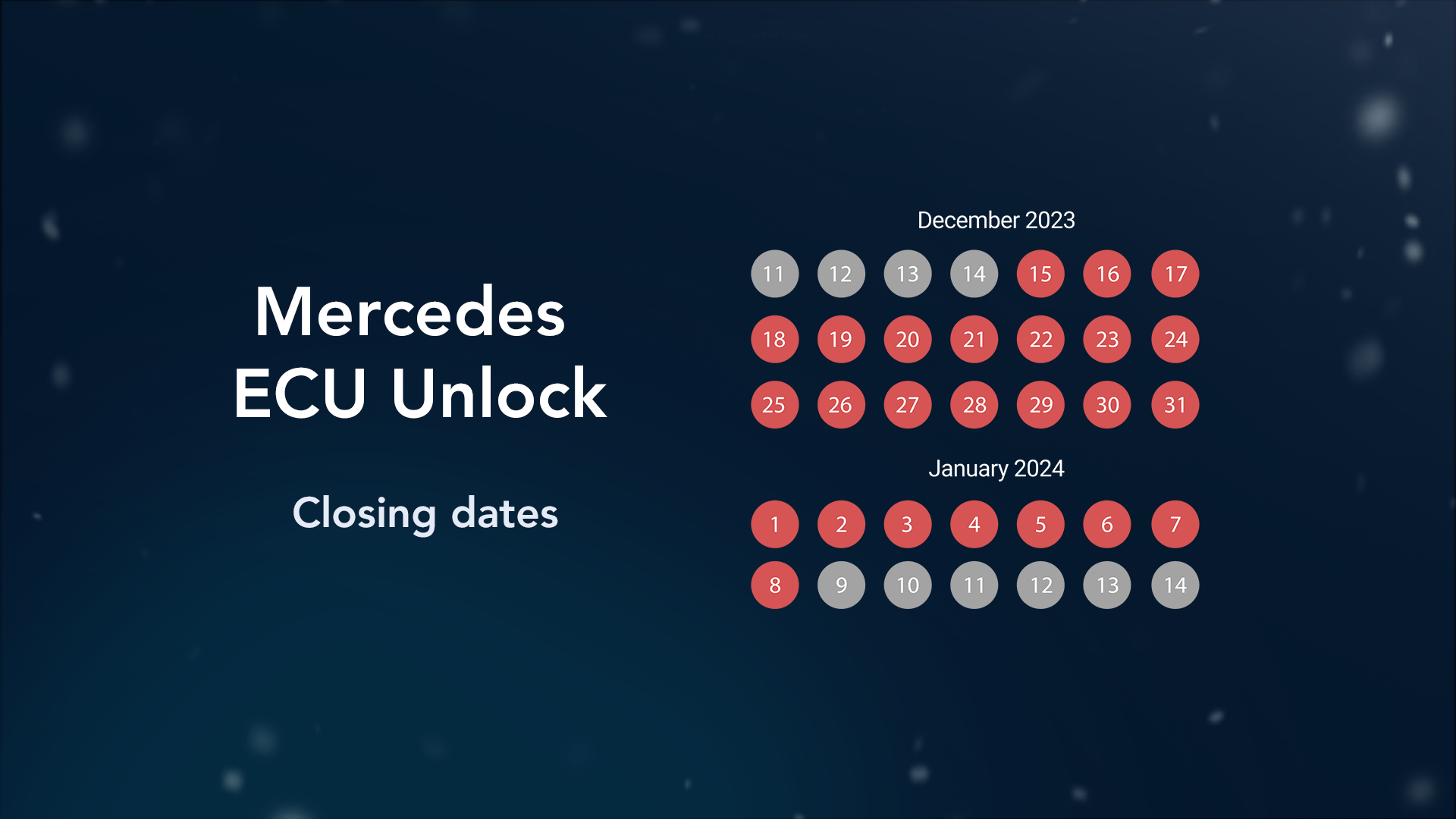 As we have different dates for our ECU Unlock Service, please consider this when making appointments for customers: Our ECU Unlock Service will be temporarily unavailable for purchase starting Friday, December 15th, to Monday, January 8th. Any ECUs received after Wednesday, December 20th are not guaranteed to be sent back before the winter break.