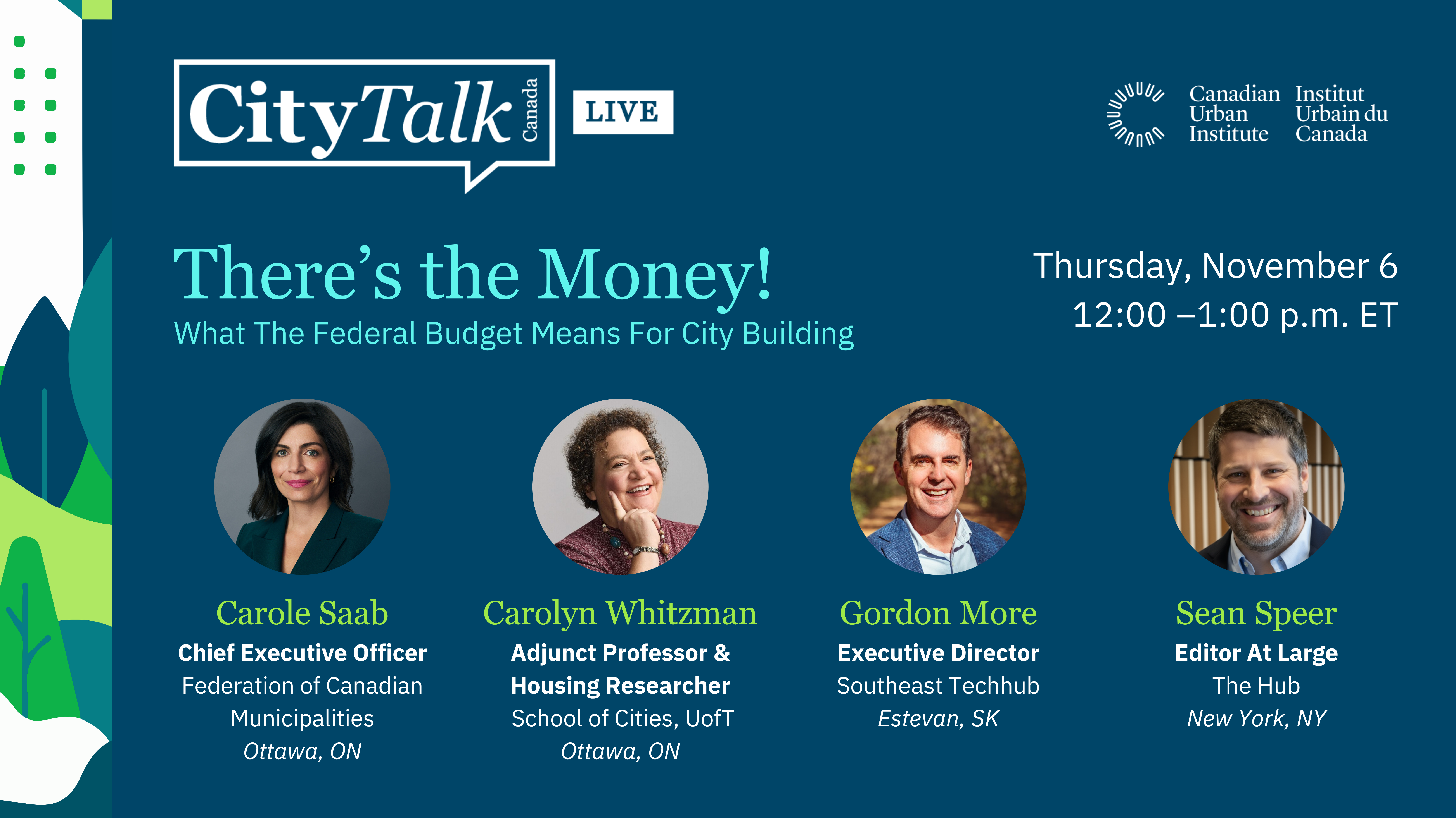 The 2025 federal budget will set the tone for how Canada plans to tackle its biggest challenges — housing, infrastructure, climate, and affordability among them. But how do those national commitments translate to what happens on the ground in our cities? Join us for CityTalk as we unpack what’s in (and not in) this year’s budget for the people shaping urban Canada. Our panel of experts will break down key components of the budget and what they mean for municipalities and city builders of all stripes. |