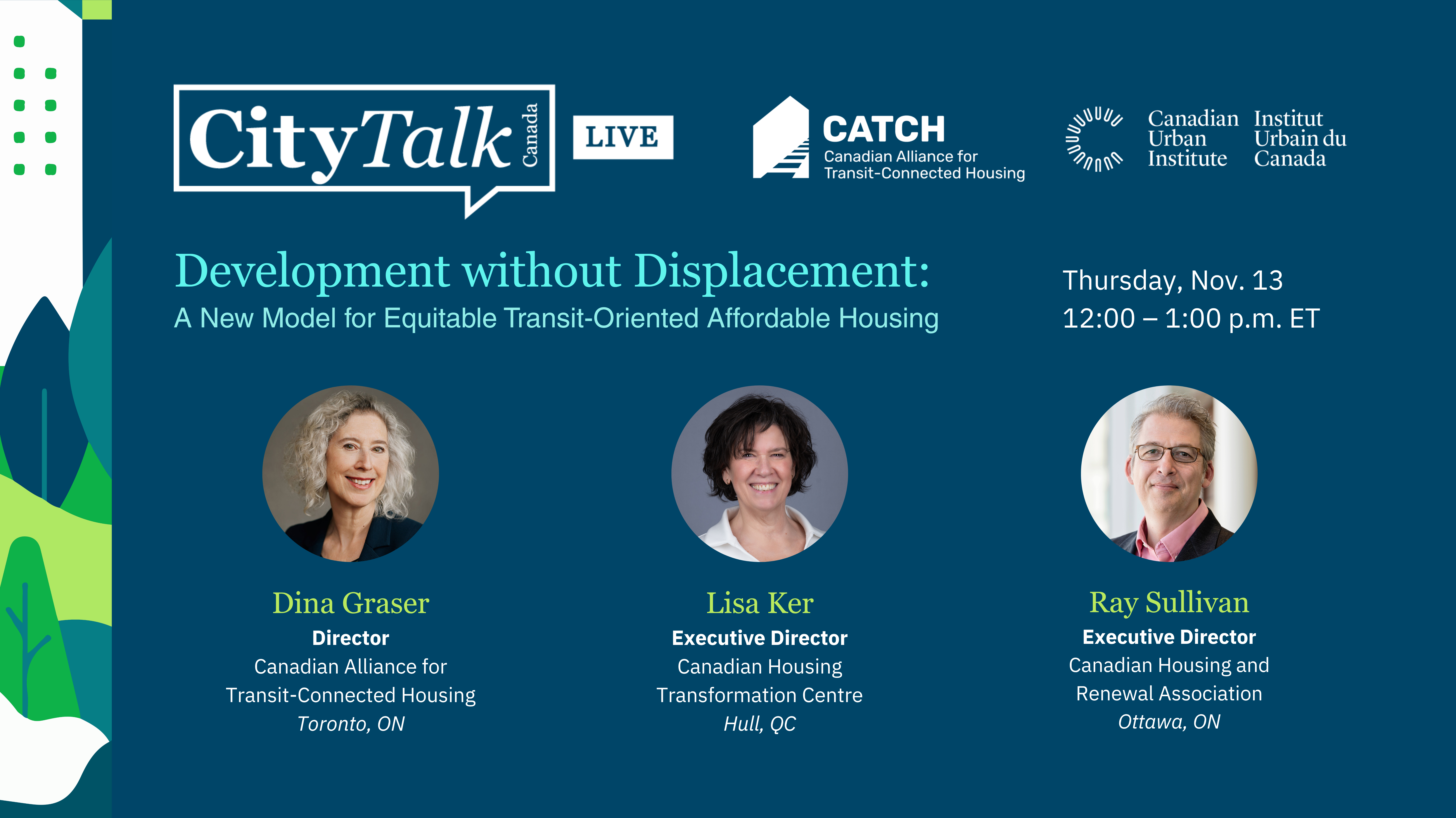 | | | | | Development without Displacement: A New Model for Equitable Transit-Oriented Affordable Housing Thursday, November 13 | 12:00 p.m. ET | Live Zoom Webinar | | Despite the promise of transit-oriented development to improve access and sustainability, its traditional application has often made housing affordability worse in cities across Canada. When major transit projects are announced, nearby property values surge, affordable homes are lost to redevelopment, and low-income residents—often racialized and equity-deserving communities—are displaced. Rising speculation and demand make it even harder for non-market housing providers to secure financing, while existing policies and zoning frameworks reinforce these barriers. Next week on CityTalk Live, hear how the Canadian Alliance for Transit-Connected Housing is developing a new model to ensure that transit investments also deliver housing affordability and equity. Our panel will explore how the economics of transit-oriented development create barriers to preserving and developing affordable housing; the challenges nonprofit housing providers face in accessing flexible, affordable capital; new financing models that can address these gaps; and how emerging approaches can prevent displacement and strengthen communities. Join us for this essential conversation on how to reshape transit-oriented development so it builds inclusive, affordable communities across Canada. | | | | | |