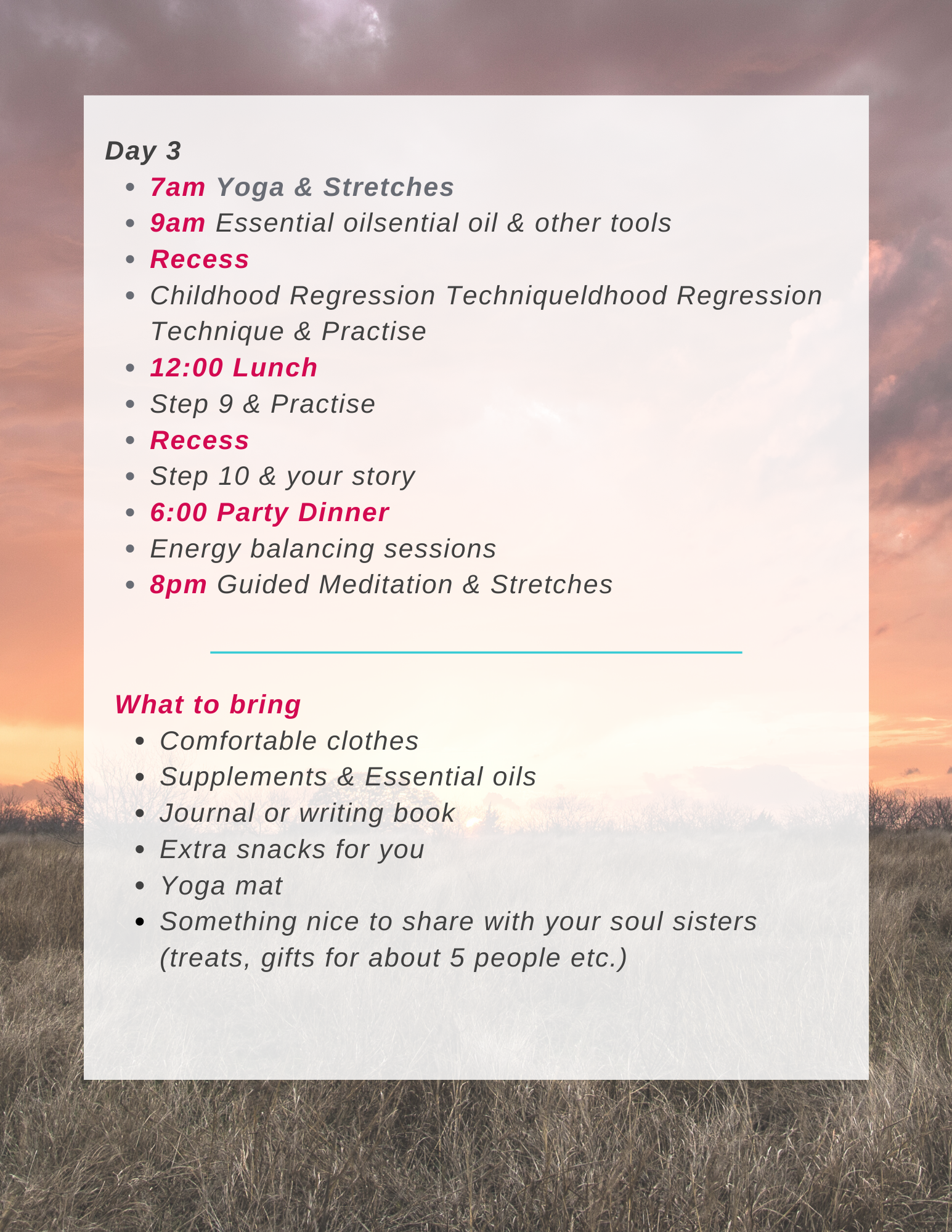 See you next week. It will be a wonderful time of bonding and sisterhood, healing and awakening. Pack comfy clothes.