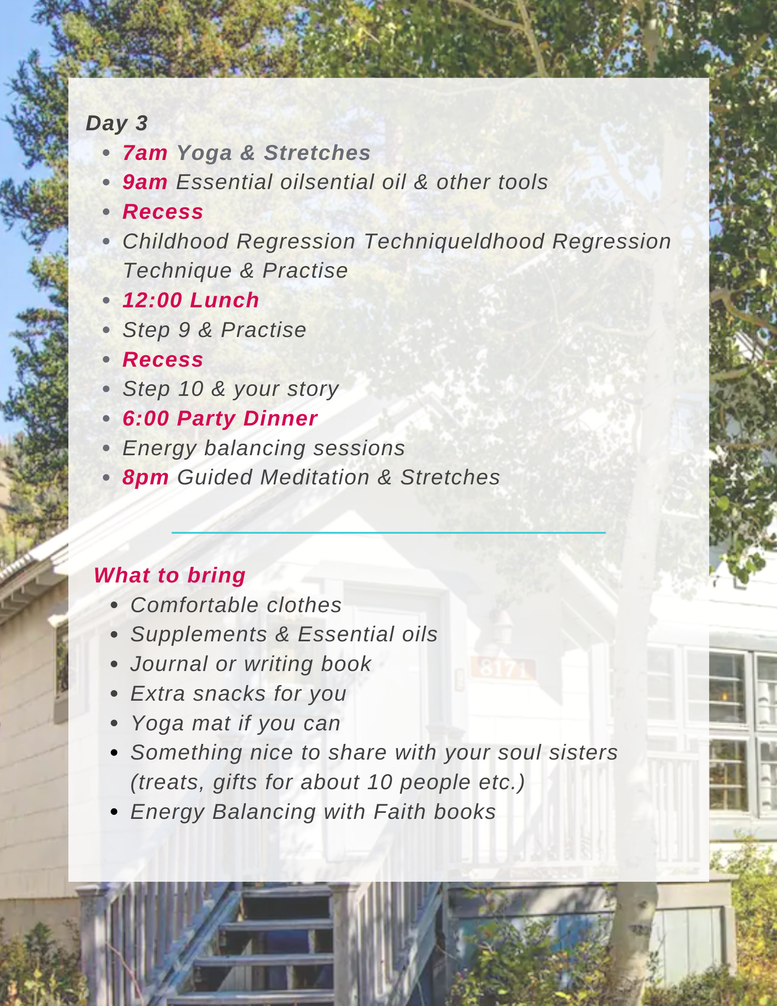 Scroll all the way down and you will find the agenda of what we will be doing daily 🌸 It is fairly relaxing but we will have many deep and meaningful conversations.