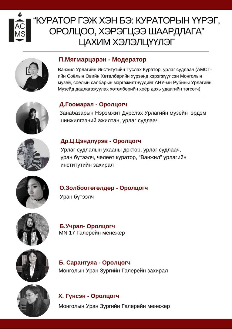 Хэлэлцүүлэг хийх шалтгаан: Монголын урлагийн салбарт куратор гэдэг нэршил танигдаад багагүй хугацааг өнгөрчээ. Нэршлийн хувьд аваад үзвэл манайд сүүлийн 10-аад жил илүү хэрэглээнд орж эхэлсэн байна. Уг нэр томьёог хэлнийх нь хувьд тодорхойлбол Латин хэлний curatus гэдэг үгнээс гаралтай, “харж хандан, хадгалан хамгаалах” гэх утгатай үг хэдий ч өнөөдөр куратор гэдэг нэршил нь дэлхийн урлагийн экосистемд зөвхөн хэлний утгын төвшинд хашигдахгүй харин илүү нарийвчилсан тодорхой ур чадвартай мэргэжилтнүүдийг нэрлэдэг болсон байна. Тухайлбал, Нью-Йоркийн Бард Их Сургуульд Кураторын мэргэжлээр Магистрийн зэрэг олгож, урлагийн түүх, судалгааны суурьтай судлаачдыг Куратор болгон бэлтгэн гаргадаг. Энэ мэтээр маш нарийсан хөгжиж байгаа тухайн мэргэжил, түүний нэршил, ойлголт Монголын соёл урлагийн салбарт ч ялгаагүй хэрэгцээ шаардлага, цаг хугацаа нь болж орж ирсэн байна. Гэхдээ өдий болтол уран бүтээлчдийн хувьд, урлаг судлалаар суралцаж буй оюутануудын хувьд ч, цаашлаад олон нийтийн хувьд ч “Куратор гэж хэн бэ? Юу хийдэг хүн юу бэ?” гэсэн асуултууд байсаар байна. Тиймээс энэ сэдвийн дагуу Кураторууд хийгээд салбарын төлөөлөл болсон хүмүүс хоорондоо ярилцаж, өөрсдийн байр суурь, санаа бодлыг хуваалцах нь маш чухал юм. Энэ хэлэлцүүлэг нь Монголын соёл урлагийн экосистемийг зөв голдрилоор, олон улсын стандарттай уялдан хөгжүүлэхийн төлөө хичээн ажиллаж байгаа бүх талуудад бие биенээ илүү ойлгох, суралцах нэн хэрэгцээтэй солилцоо болно гэж найдаж байна.
