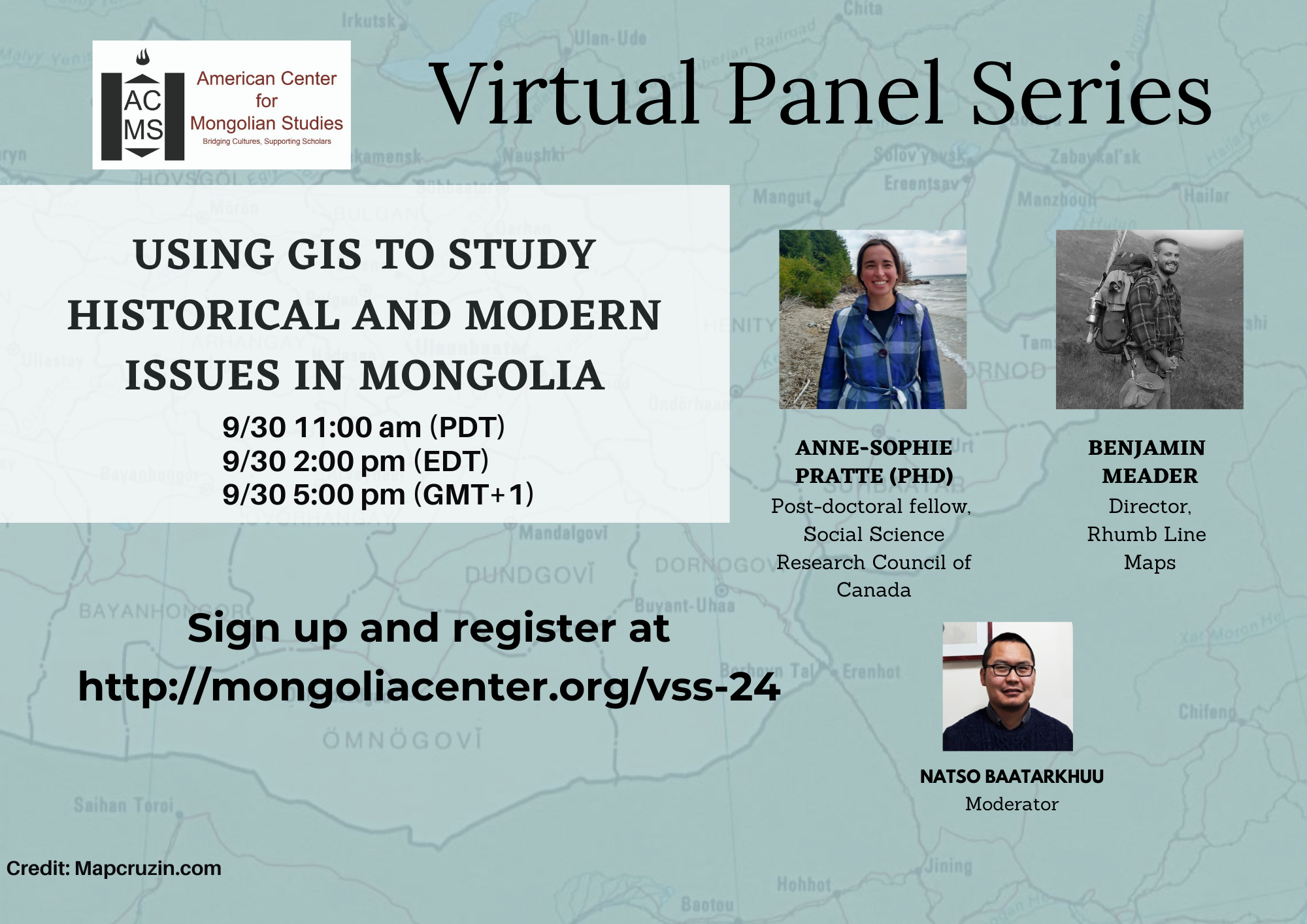 The September Virtual Panel Series, which will be held in English, will focus on using Geographic Information Systems (GIS) to study historical and modern issues in Mongolia. The panel will have two speakers taking the historical and modern perspectives of the panel’s theme.