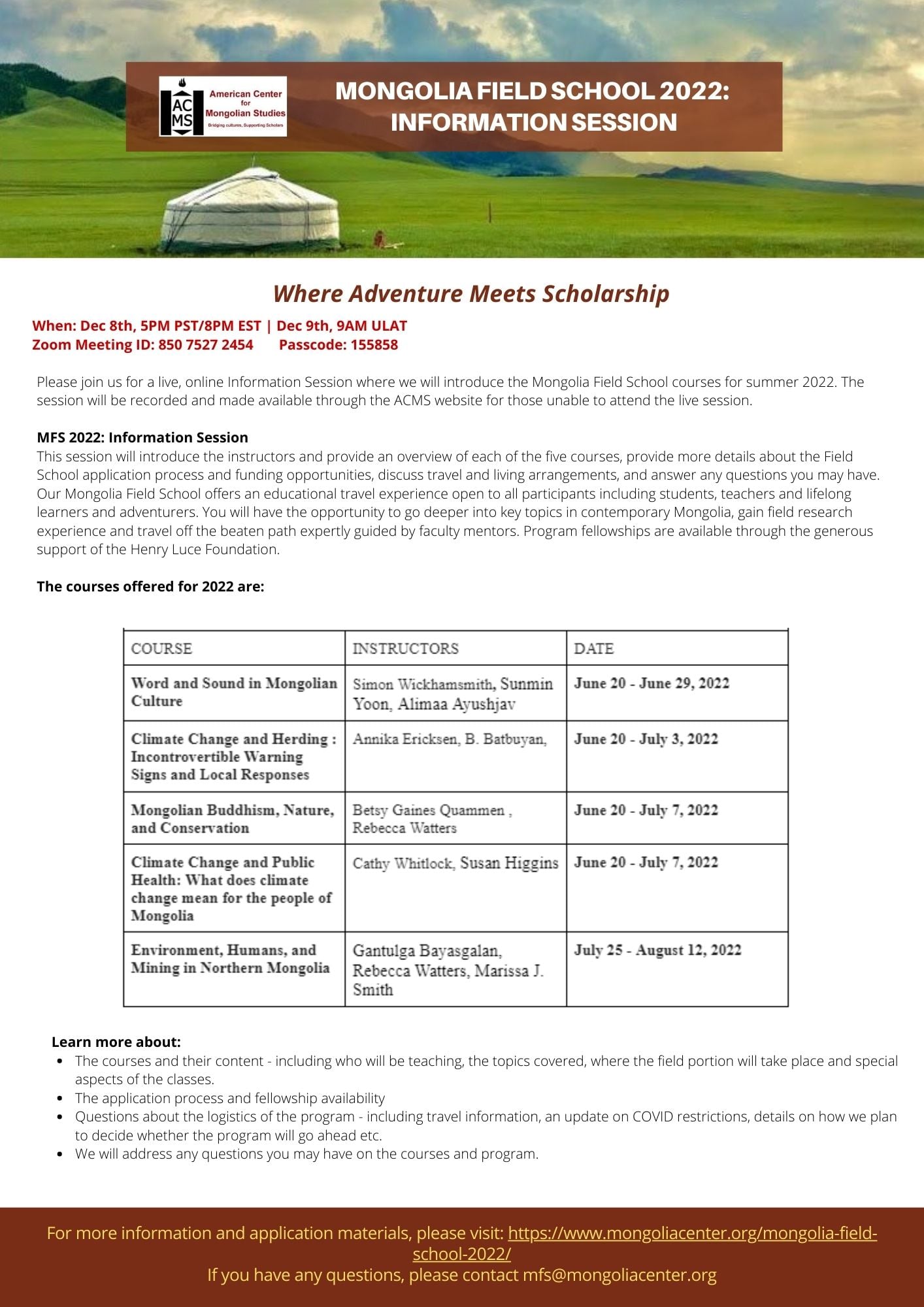 This session will introduce the instructors and provide an overview of each of the five courses, provide more details about the Field School application process and funding opportunities, discuss travel and living arrangements, and answer any questions you may have.