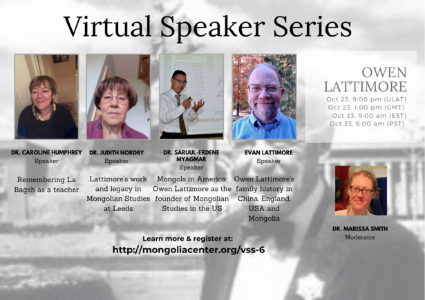The October Virtual Speaker Series panel session will be on the renowned Mongolist Owen Lattimore, with speakers Dr. Caroline Humphrey, Dr. Judith Nordby, Dr. Saruul-Erdene Myagmar, and Mr. Evan Lattimore, and moderated by Dr. Marissa Smith. Dr. Humphrey will present about remembering La Bagsh as a teacher; Dr. Nordby's presentation is "Lattimore's work and legacy in Mongolian Studies at Leeds"; Dr. Saruul-Erdene will speak about "Mongols in America: Owen Lattimore as the founder of Mongolian studies in the US"; and Mr. Lattimore will present about Owen Lattimore's family history in China, England, USA and Mongolia.