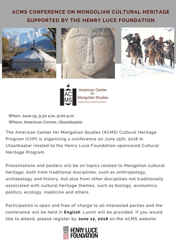 Subject: Reminder: ACMS Conference on Mongolian Cultural Heritage Supported by the Henry Luce Foundation - June 15th, 2018