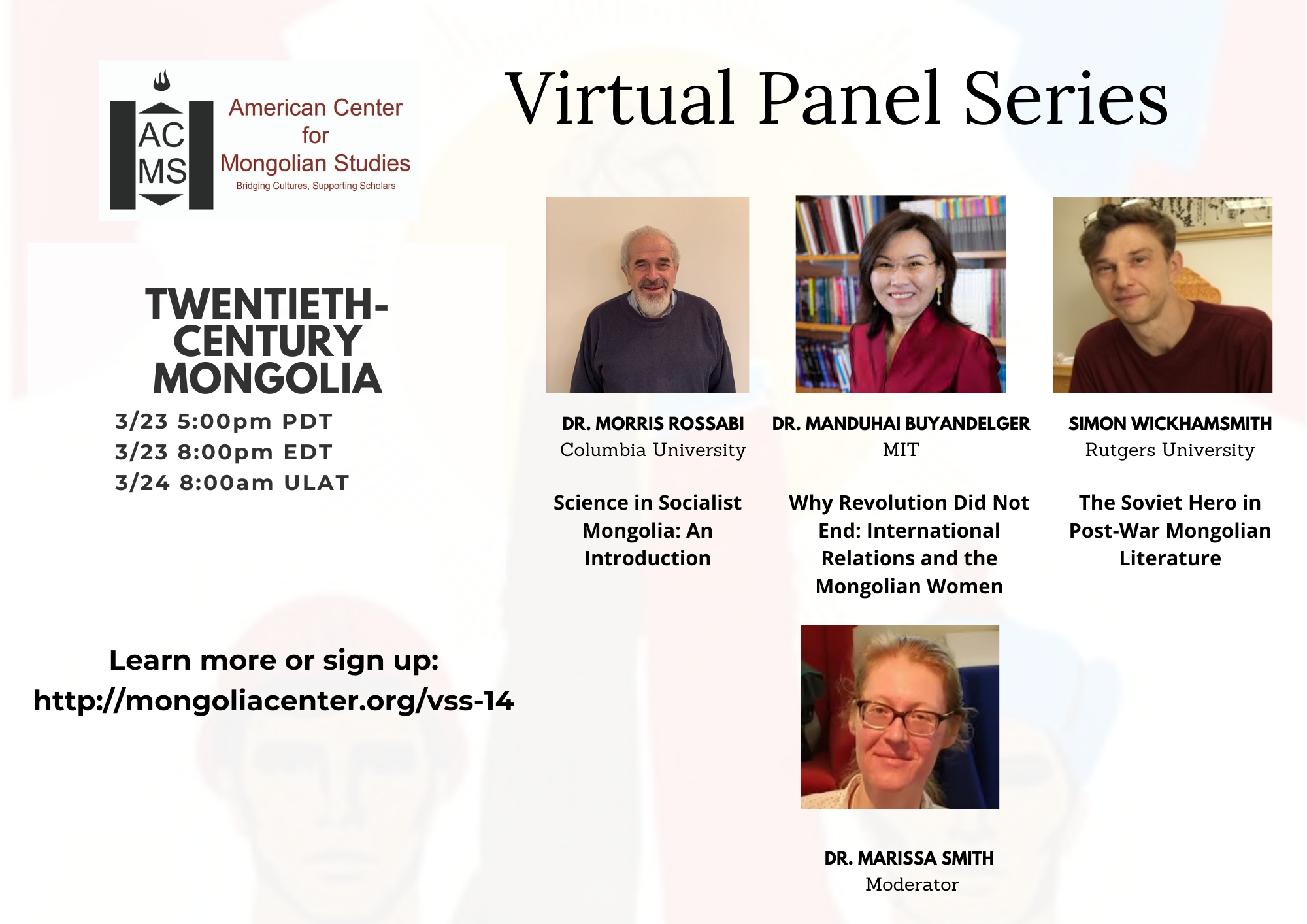 | The ACMS Virtual Panel Series on "Twentieth Century of Mongolia" was hosted on March 23, with professors from MIT, Columbia, and Rutgers University, to discuss the literature, science, and women's movement of the Mongolian People's Republic period. The event garnered over 200 interests on Facebook, and has been viewed over 800 times on the live stream, as of March 25. The comments received on Zoom, Facebook, and email were overall extremely positive, thanking the speakers--and the ACMS for the initiative to introduce the experts' work to the general public.