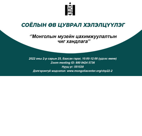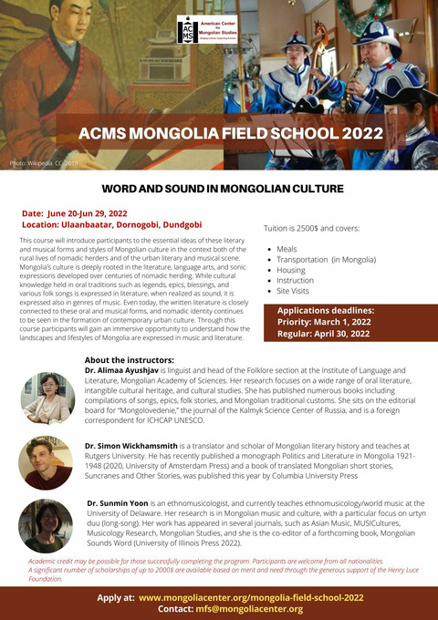 This Month in Mongolian Studies is a monthly listing of selected academic activities, resources and other material related to Mongolia. This list is based on information the ACMS has received and is presented as a service to its members. If you would like to submit information to be included in next month's issue please contact the ACMS at info@mongoliacenter.org This publication is supported in part by memberships. Please consider becoming a member of the ACMS, or renewing your membership by visiting our website at mongoliacenter.org/join.