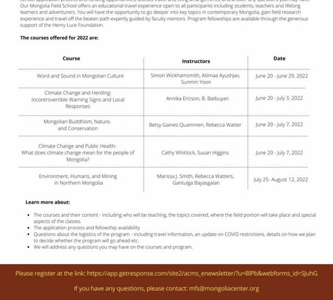 On March 8, the ACMS staff and Mongolia Field School course instructors organized a live info session to provide an overview of each of the five courses, offer more details about the Field School application process and funding opportunities, discuss travel and living arrangements, and answer any questions students may have. The upcoming Mongolia Field School program offers an educational travel experience open to all participants including students, teachers and lifelong learners and adventurers. Participants will have the opportunity to go deeper into key topics in contemporary Mongolia, gain field research experience and travel off the beaten path expertly guided by faculty mentors. The webinar is now available to watch on YouTube via the following link.