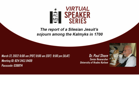 | | Dr. Paul Shore, senior researcher at the University of Hradec Karlove, presented at our March Virtual Speaker Series about "The report of a Silesian Jesuit’s sojourn among the Kalmyks in 1700" on Mon, Mar 17, 9am EDT. The presentation was in English and will soon be uploaded to ACMS YouTube channel with Mongolian subtitles. However, the full livestream is also available on the ACMS Facebook page. |