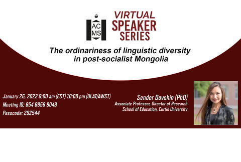 | | Dr. Sender Dovchin, Associate Professor/Director of Research at Curtin University, presented at our next Virtual Speaker Series about "The ordinariness of linguistic diversity in post-socialist Mongolia" on Wed, Jan 26, 9am EST | 10pm ULAT. The discussion was in English and will soon be uploaded to ACMS YouTube channel with English subtitles. However, the full livestream is also available on the ACMS Facebook page. |