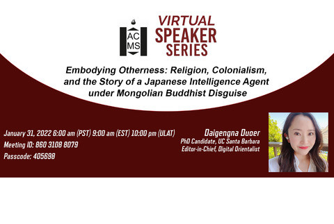 | PhD Candidate Daigengna Duoer (UC Santa Barbara) presented "Embodying Otherness: Religion, Colonialism, and the Story of a Japanese Intelligence Agent under Mongolian Buddhist Disguise" on Mon, Jan 31, 9am EST | 10pm ULAT. The discussion was in English and will soon be uploaded to ACMS YouTube channel with English subtitles. However, the full livestream is also available on the ACMS Facebook page. |