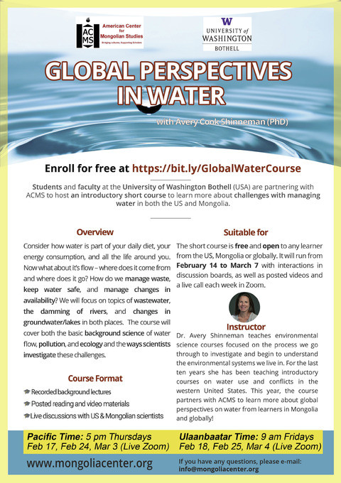 Students and faculty at the University of Washington Bothell (USA) are partnering with ACMS to host an introductory short course to learn more about challenges with managing water in both the US and Mongolia. The course will focus on topics of wastewater, the damming of rivers, and changes in groundwater/lakes in both places. The course will cover both the basic background science of water flow, pollution, and ecology and the ways scientists investigate these challenges. The course will include recorded background lectures, posted reading and video materials and live discussions with both US and Mongolian scientists sharing some their expertise and interest in water as well as the complexity of studying such an important resource.