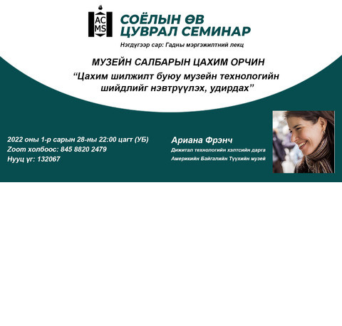 | We are pleased to announce that the "Соёлын өв цуврал хэлэлцүүлэг" (Cultural Heritage Panel) series continues this year under the title of "Соёлын өв цуврал семинар" (Cultural Heritage Colloquium). The very first event was a guest expert talk, titled “Digital transformation: Lessons in governance, scale, and technologies” on January 28th, 10 PM ULAT. Our guest speaker was Dr. Ariana French, the director of Digital Technology at American Museum of Natural History. The talk was the first part of the new and revised Cultural Heritage Discussion series, now retitled Cultural Heritage Colloquium. The expert talk has been interpreted from the English presentation into Mongolian, but the main language of the colloquium will be Mongolian. The talk drew 33 attendants into the Zoom room, and over 110 views on the immediate Facebook live stream.