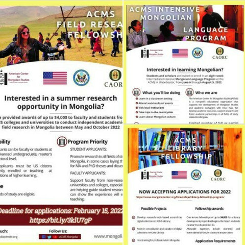 ACMS Library Fellowship Program provides US citizens who are advanced graduate students or faculty in library science or related fields with up to $4000 to conduct short-term projects and/or research in Mongolia between May and October. This program helps support the development of the ACMS research library through specific defined projects designed to enhance the collection content and resource availability. The fellowship is supported with funding from the US Department of State's Bureau of Educational and Cultural Affairs through a grant by the Council of American Overseas Research Centers. Deadline for receipt of complete applications: February 15, 2022.