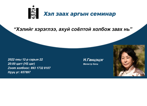 In December we held the last Language Methodology seminar of 2022. For our seminar instructor we had Mrs. Gantsetseg N., a retired teacher, who made her career teaching Mongolian as a second language, first to U.S. Embassy staff in Ulaanbaatar and later to Peace Corps volunteers in Mongolia. Her seminar topic was "Teaching language in relation to culture".