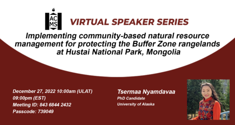 | Our VSS December episode is up on our Facebook page. Tsermaa Nyamdavaa, a PhD student at the University of Alaska, Anchorage, was our guest speaker. By request of our speaker this event was in English. Her topic was "Implementing community-based natural resource management for protecting the Buffer Zone rangelands at Hustai National Park, Mongolia". Click the button below to watch Tsermaa's presentation.