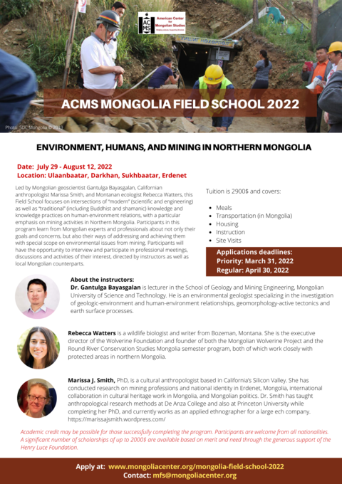 Please note that for 2022 we are holding 2 sessions for Mongolia Field School - Session 1: Climate Change and Herding: Incontrovertible Signs and Local Response; Session 2: Environment, Humans and Mining in Northern Mongolia. Other sessions mentioned in the webinar have been postponed to 2023.