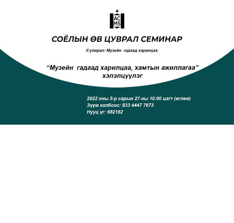 | | | The fifth "Соёлын өв цуврал семинар" (Cultural Heritage Colloquium) event of the year was an online panel discussion, titled “Museum and International Collaboration”, which was held on May 27th, 10 AM ULAT. The main language of the colloquium was Mongolian. The panelists were D.Bumaa, Head of the National Committee of the International Council of Museums, J.Myandas, Chief of Treasury Department, Museum of Natural History of Mongolia, D.Erdmaa, Head of Marketing, Chinggis Khaan Museum, B.Byambajav, Director, Dornogobi Provincial Museum.