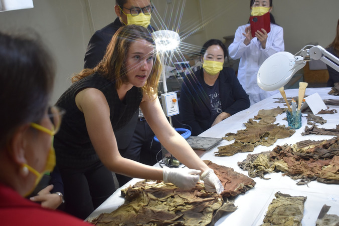 | | Ulaanbaatar workshop: Project Fellow Kristen Pearson showing conservators the conservation progress of the rare 'deel'. |