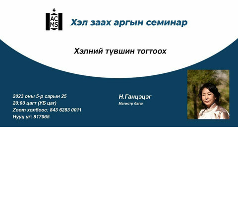 When: 23 June 2023 14-15:30p.m. Where: MULS Administration Building 1 Fourth Floor: Conference hall -№ 43 (ХААИС–н захиргааны байр хурлын танхим) Link: https://us06web.zoom.us/j/87478519957?pwd=eERYK3dtTmNVOWZtZ2N1TWloVjZuUT09 ID: 874 7851 9957 Passcode: 108019