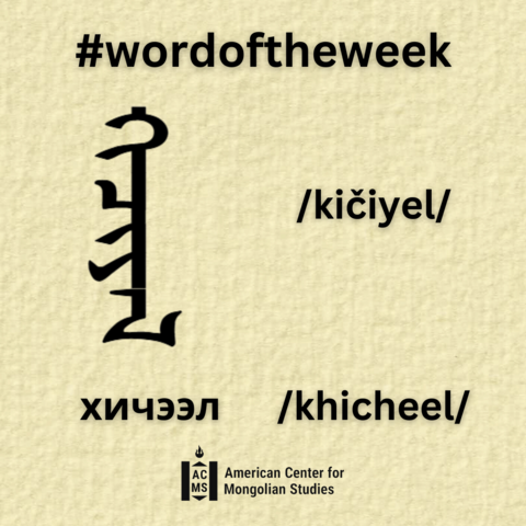 ᠬᠢᠴᠢᠶᠡᠯ /kičiyel/ - (Cyrillic: хичээл /khicheel/, English: lesson, subject, attempt) - [1] noun form of striving, attempting, trying, [2] schooling under approved regular schedule, program with a professional teacher.