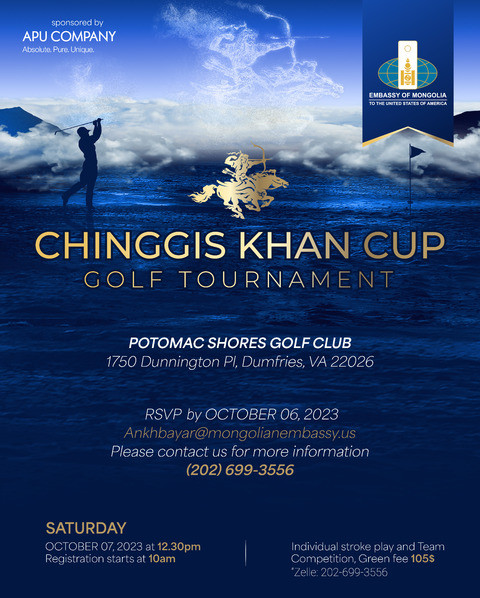 | Chinggis Khan Cup The Mongolian Embassy to the U.S. is organizing a golf tournament on October 7.2023. The tournament will be held at Potomac Shores Golf Club (1750 Dunnington Place, Dumfries, VA 22026).