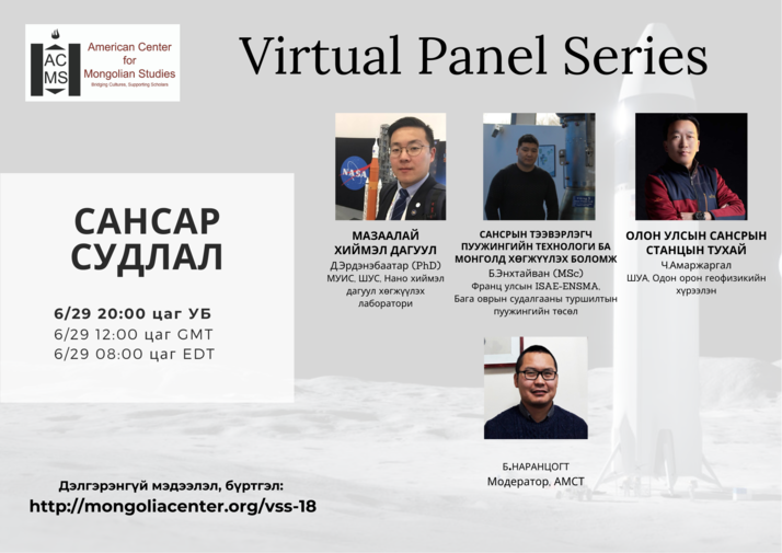 Бид “Virtual Panel Series” цувралын 6-р сарын дугаарыг монгол хэл дээр зохион байгуулж байгаа бөгөөд энэ сарын сэдэв “Сансар судлал”. Энэ удаагийн дугаарт гурван илтгэл тавигдах бөгөөд дараа нь үзэгчдийн асуултанд хариулна. Илтгэл №1. "Мазаалай хиймэл дагуул" Др. Д.Эрдэнэбаатар, МУИС, ШУС, Нано хиймэл дагуул хөгжүүлэх лаборатори