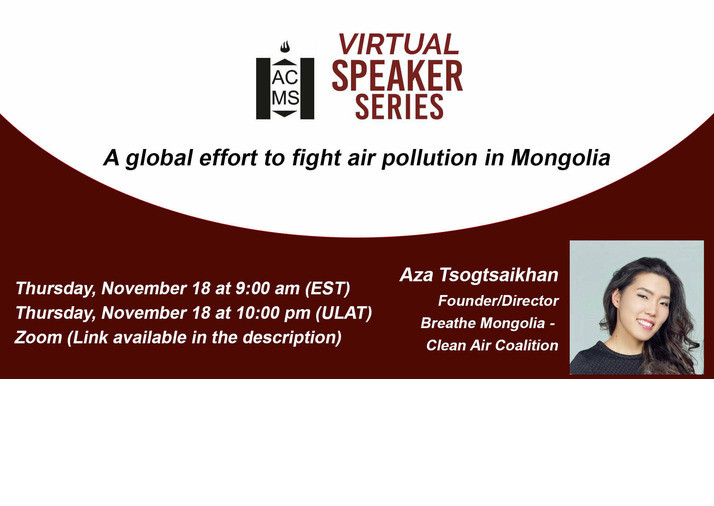 The September Virtual Speaker Series, which will be held in English, will be by Ms. Aza Tsogtsaikhan of Breathe Mongolia - Clean Air coalition.