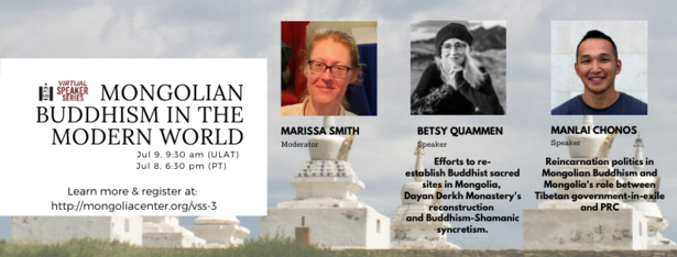 This Virtual Speaker Series session will be on Mongolian Buddhism in the modern world, with speakers Betsy Quammen and Manlai Chonos, and moderated by Dr. Marissa Smith. Betsy will discuss efforts to re-establish Buddhist sacred sites in Mongolia, specifically the reconstruction of Dayan Derkh Monastery. She will also touch on the monastery's story of Buddhism-Shamanic syncretism. Manlai will discuss reincarnation politics in Mongolian Buddhism and Mongolia's role between Tibetan government-in-exile and PRC.