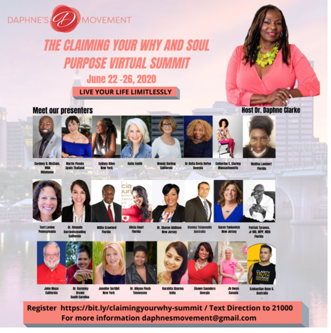 | | I hope you registered for the upcoming “Claiming Your Big Why and Soul Purpose Summit”, it starts next Monday so register and join me and a host of other exciting experts as we share how we claimed our Big Why and Soul Purpose. |