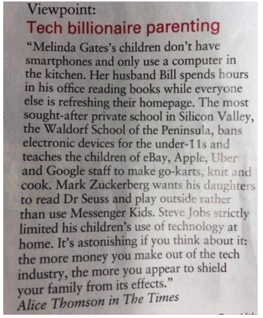 “It’s astonishing if you think about it: the more money you make out of the tech industry, the more you appear to shield your family from its effects.”
