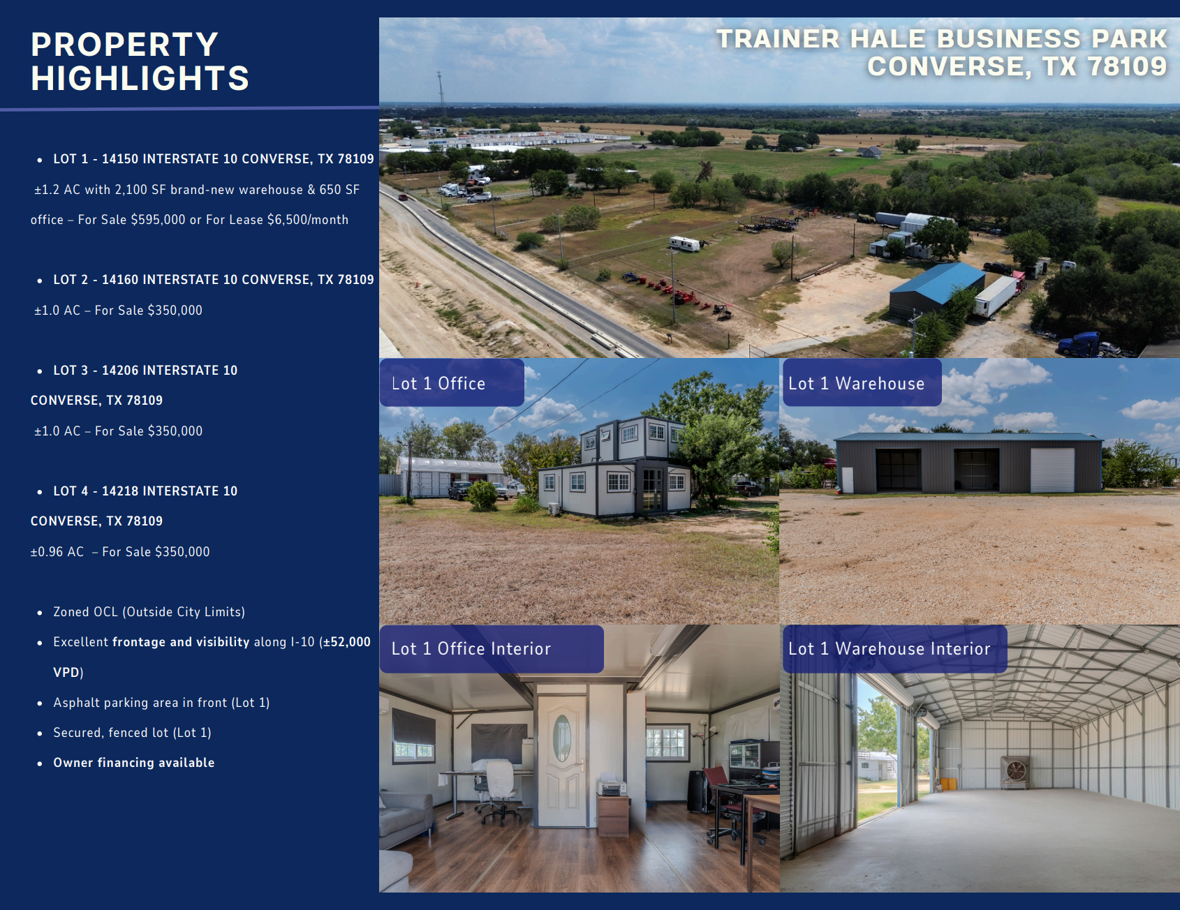 Lot 1: +/- 1.2 AC with brand-new warehouse and 650 SF office $6,500/month lease