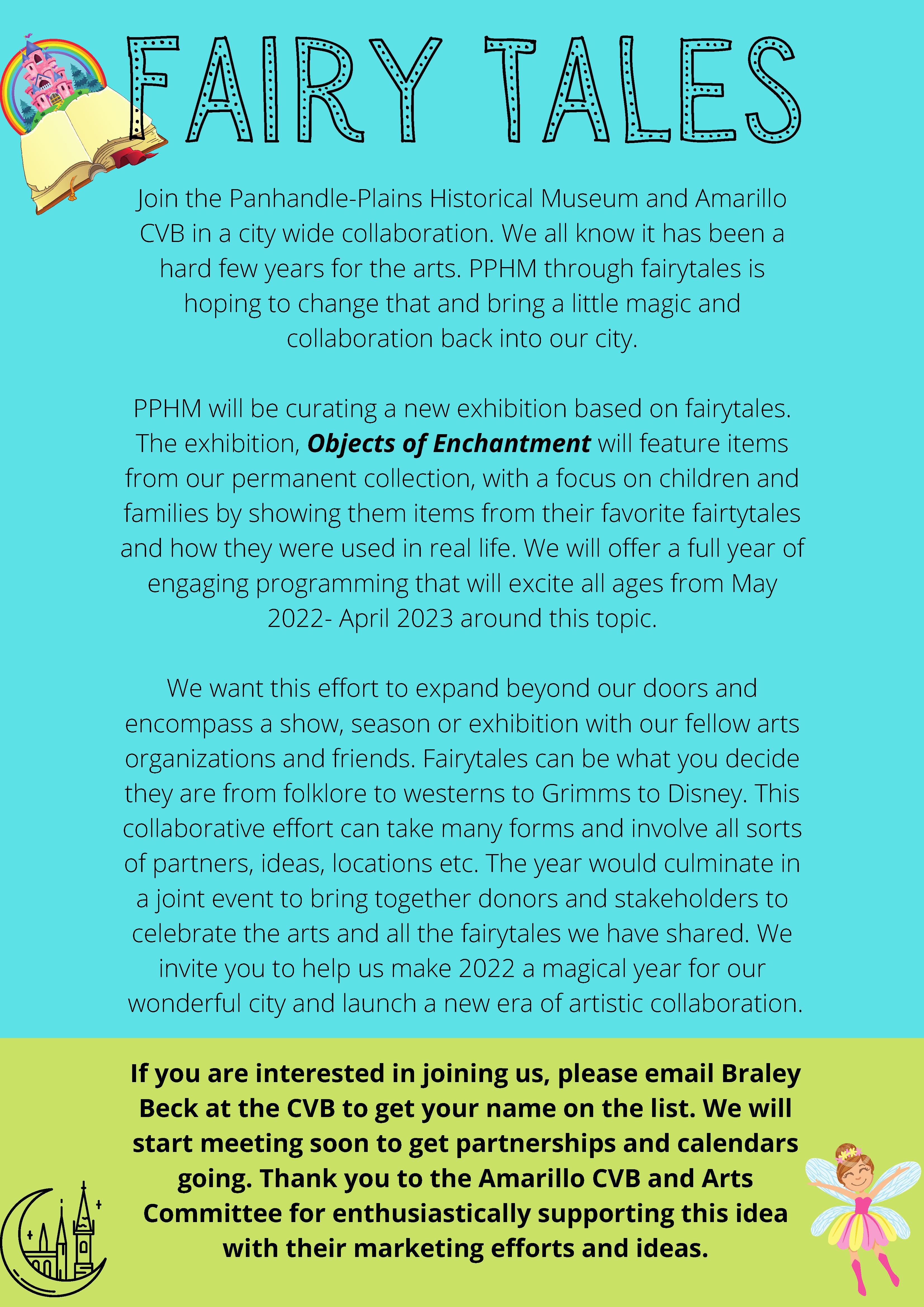 I'm reaching out again to send more information on the Fairy Tales collaboration that Panhandle-Plains Historical Museum wants to put together (more information below). We have had a fantastic response from the community and are looking forward to exciting events in 2022 - 2023!