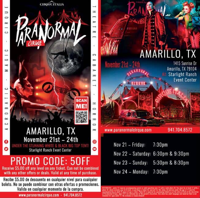 Step into the dark side of the circus when Paranormal Cirque by Cirque Italia arrives in Amarillo, November 21–24! 🎟️ Get 20% off tickets with code CIRQ20 at black.cirqueitalia.com.