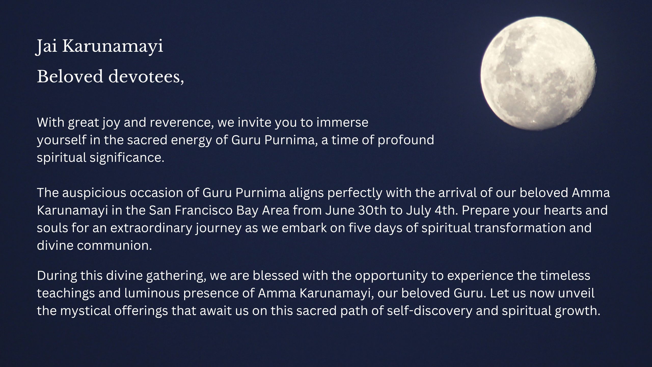 Today, dear ones, marks the last day to secure your place in these divine gatherings. Seize this precious moment to register and be enveloped by the loving embrace of Amma Karunamayi.