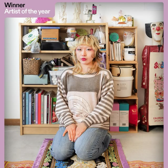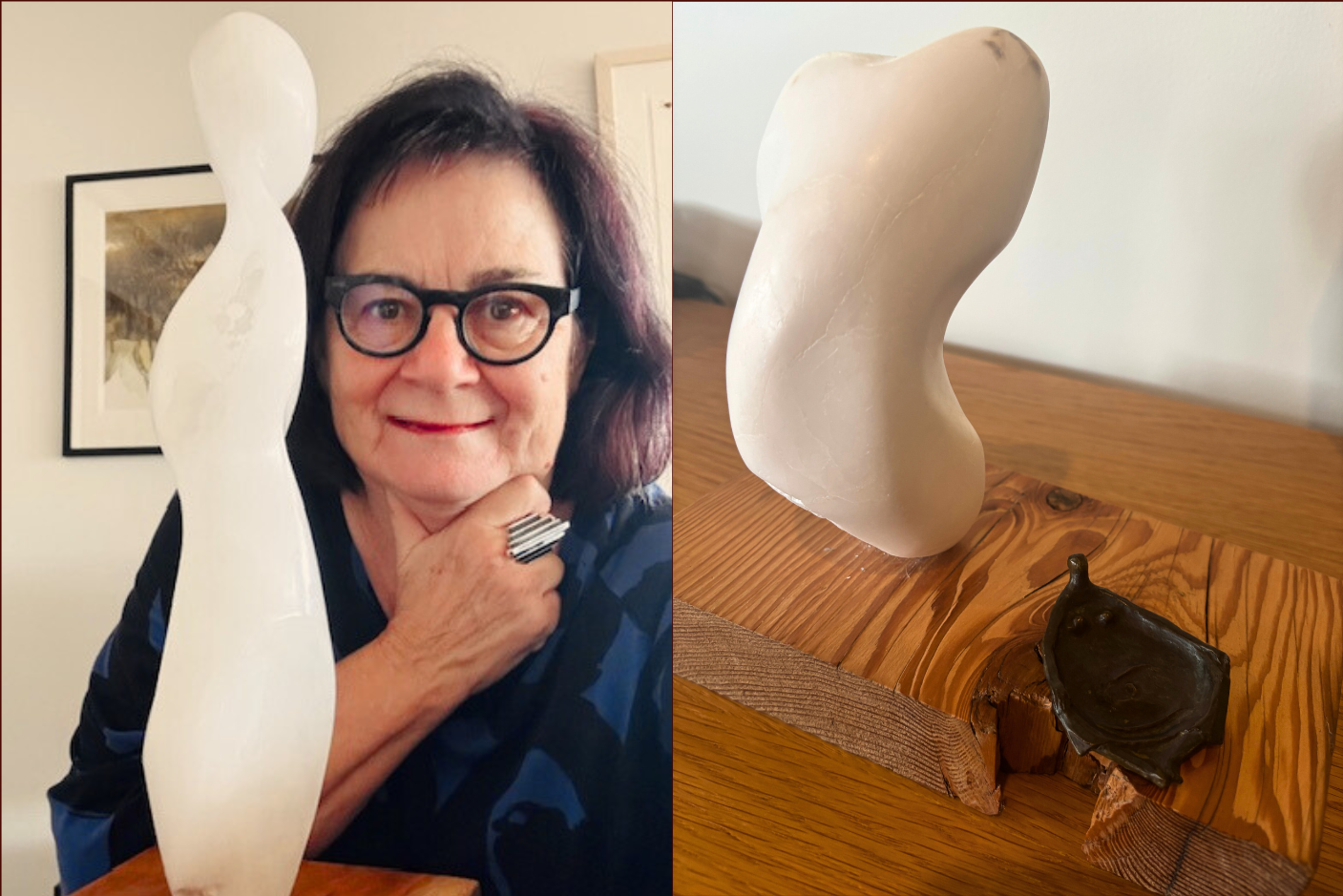Left, Rebecca with her alabaster sculpture Twisted Sister