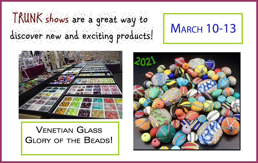 Hello Happy Sunday Beaders! In just a few days the wonderful Venetian Glass Bead Show will be here at the store! Join us as we welcome The Glory of Beads and their fantastic collection of authentic Venetian hand made glass beads and jewelry. Due to the Trunk Show this upcoming week we will be open Saturday if you need to shop! Call ahead for appointment time. 561-649-9909. Out of town customers, we offer virtual shopping and assistance! Stay Safe! |