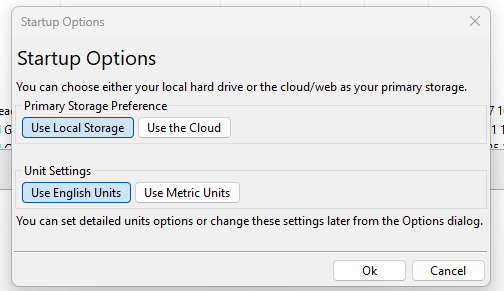 Here you can select whether you prefer to work primarily from the Cloud/Web based storage or use local storage on your own hard drive. You can also select Metric or English units for a quick setup though you can further customize your unit settings on the Tools->Options (BeerSmith4->Preferences on Mac) dialog.