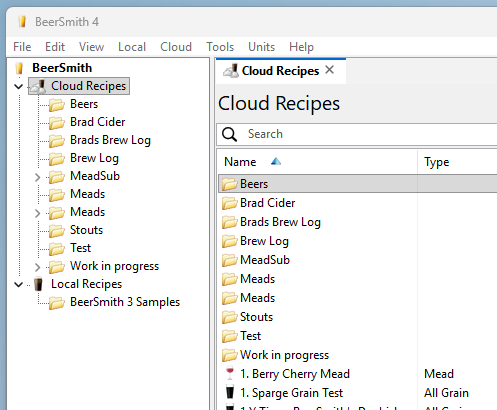 Conversely, if you select Use Local Storage then BeerSmith will use your local hard drive to store recipes, ingredients and profiles. It will work on the local shopping list, inventory, and only items you specifically copy/paste into one of your cloud views will be stored online. Using this option you can still run BeerSmith in a stand-alone mode, without shared data, and the program only needs internet access to activate and if you want to later access your cloud data or new ingredient and profile addons. Can I Still Access Both Local and Cloud Based Data?Choosing either local or cloud mode does not limit your access to the opposite storage. The only major change is which data set appears at startup and acts as your primary storage. For example, in cloud mode, the shortcut bars on the left show the cloud based listings at the top and local below them as you see here: |