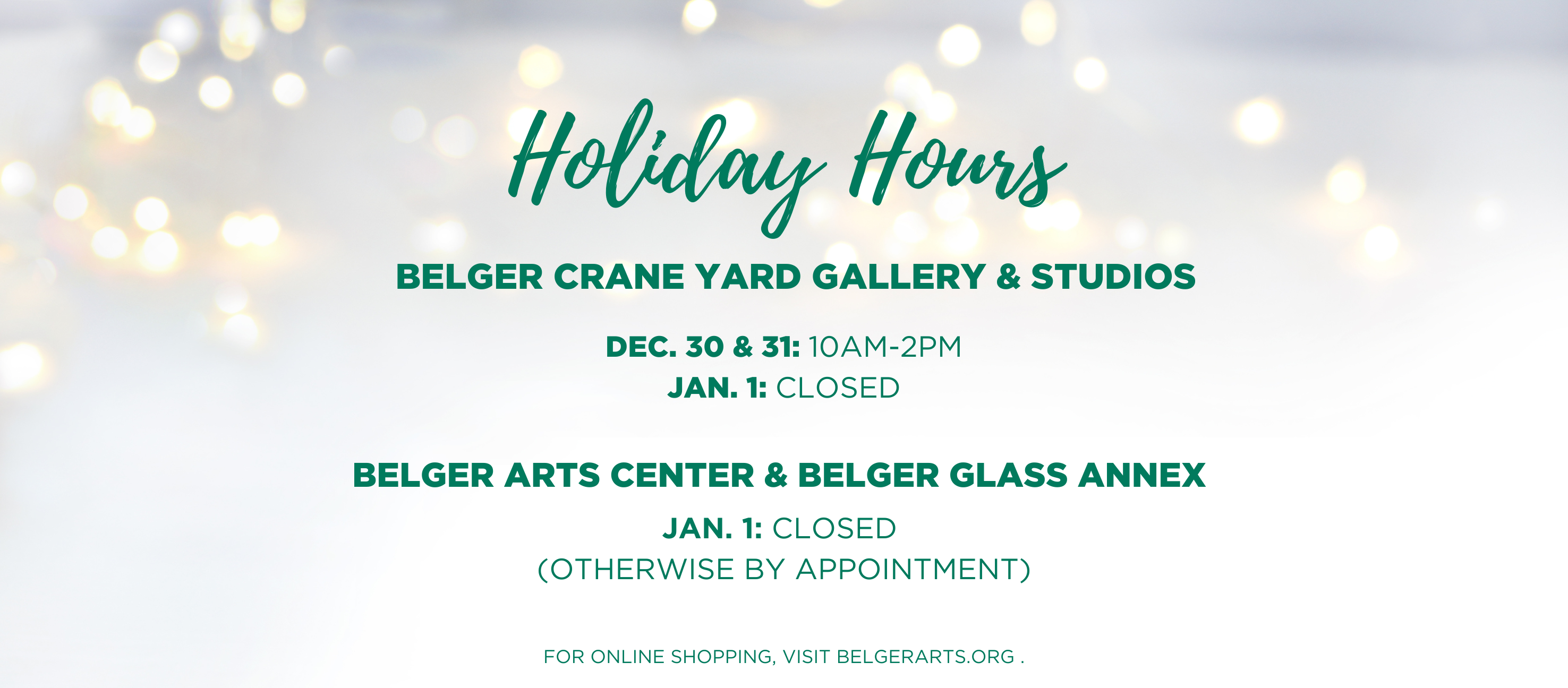 Please note our holiday hours (listed above). Our regular hours will resume on January 2, when we look forward to seeing you on the First Friday of 2026! We encourage you to visit BelgerArts.org, where you can shop for classes, gallery purchases, and more any day of the week.