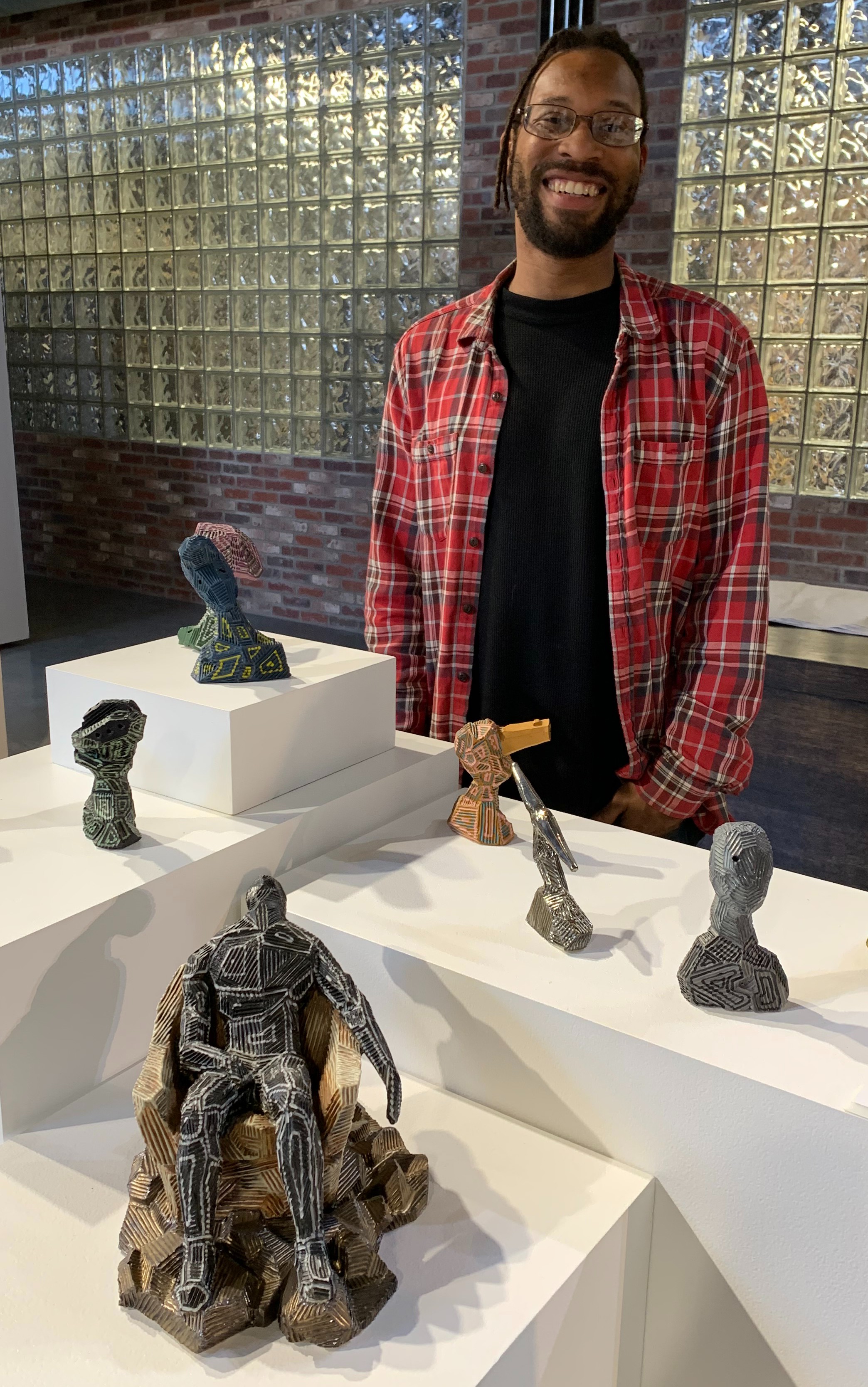 April 15 deadline: Artists in Residence Program | | Resident Artist Nicole Rene Woodard | We invite artists (emerging to established) who wish to expand upon their professional and artistic development in ceramics to apply for the Artists in Residence Program. We offer 24/7 studio access, a material and firing stipend, teaching opportunities at Belger Arts, a ceramics supply retail outlet (Crane Yard Clay) within the studio complex, and more! Go to the “Artists in Residence” tab of BelgerArts.org to find out more or contact Studio Manager Paul Maloney at pmaloney@belgerartscenter.org. | | | Final Weeks – Digital Debut | | Digital Debut artist Chandler Martin with his work on view at the Belger Crane Yard Gallery | Our current Digital Debut artist is Chandler Martin. He was born in Chicago, Illinois and raised in Plano, Texas. In 2015, he received his BFA in Ceramics from the Kansas City Art Institute. Since then, he has been actively involved with various art organizations in the Kansas City metro area.