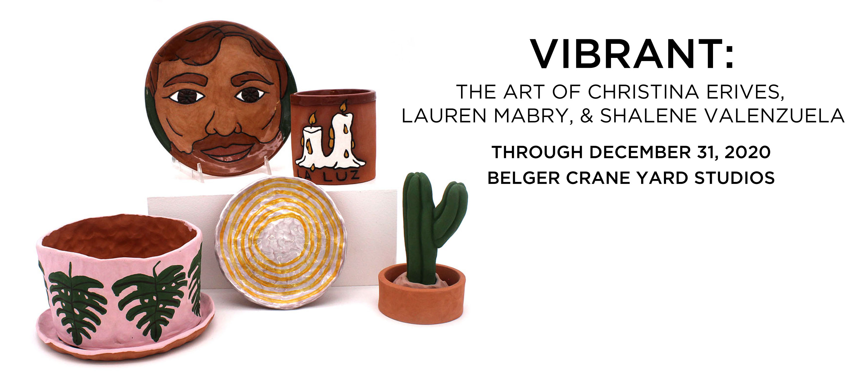 Top to bottom: Christina Erives, Figure Plate, 2016, Earthenware, 7 x 7 in.; La Luz, 2017, Earthenware, 4 x 4 in.; Planter, 2017, Earthenware, Bowl: 3.5 x 6 in, Plate: 0.5 x 6.5 in.; Tostada Plate, 2017, Earthenware, 0.5 x 5.5 in.; Small Cactus, 2016, Earthenware, 2.5 x 6 in.