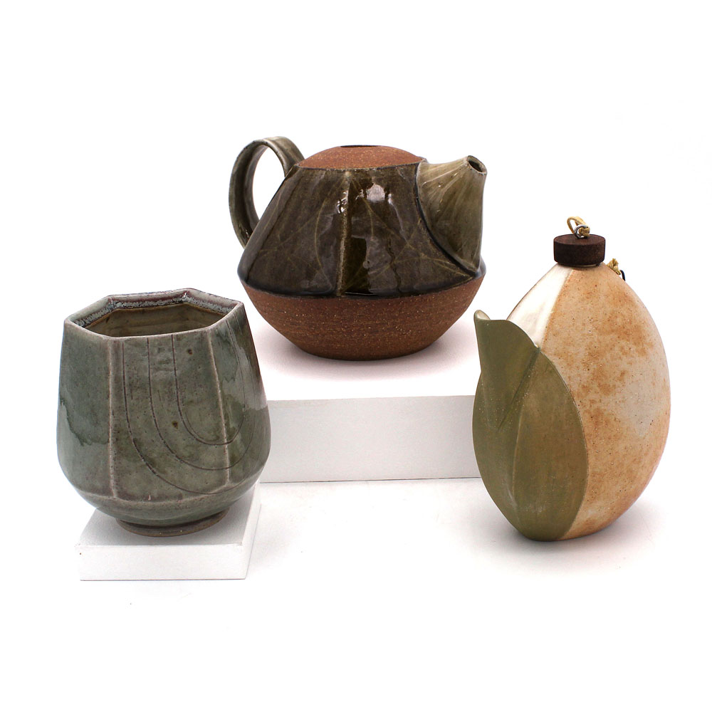 Left to right: Amanda Bury, Yunomi with Brushwork Leaves, 2020, Stoneware, slip, and glaze, 4 x 4 x 4.25 in.; Teapot with Green Glaze, 2019, Stoneware, slip, and glaze, 7.5 x 6.5 x 5.5 in.; Oil Cruet with Green Slip and Glaze, 2019, Stoneware, slip, and glaze, 6.5 x 5 x 3 in.