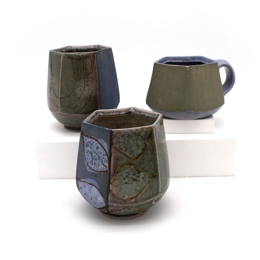 Back to front: Amanda Bury, Yunomi with Brushwork Leaves, 2020, Stoneware, slip, and glaze, 4 x 4 x 4.25 in.; Pentagonal Mug with Tea Drawing, 2020, Stoneware, slip, and glaze, 2.5 x 4 x 4 in.; Yunomi with Brushwork Leaves, 2020, Stoneware, slip, and glaze, 4 x 4 x 4.25 in.